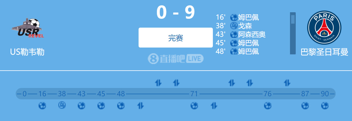 上半场,姆巴佩在第16分钟和第45分钟分别左脚攻门和头球破门,加上阿森西奥的传射,巴黎上半场就已经4-0领先。下半场比赛中,阿森西奥再次助攻姆巴佩破门,贡萨洛-拉莫斯点球命中,穆阿尼双响,恩杜尔也有一球,最终巴黎以9-0轻取对手,顺利晋级。